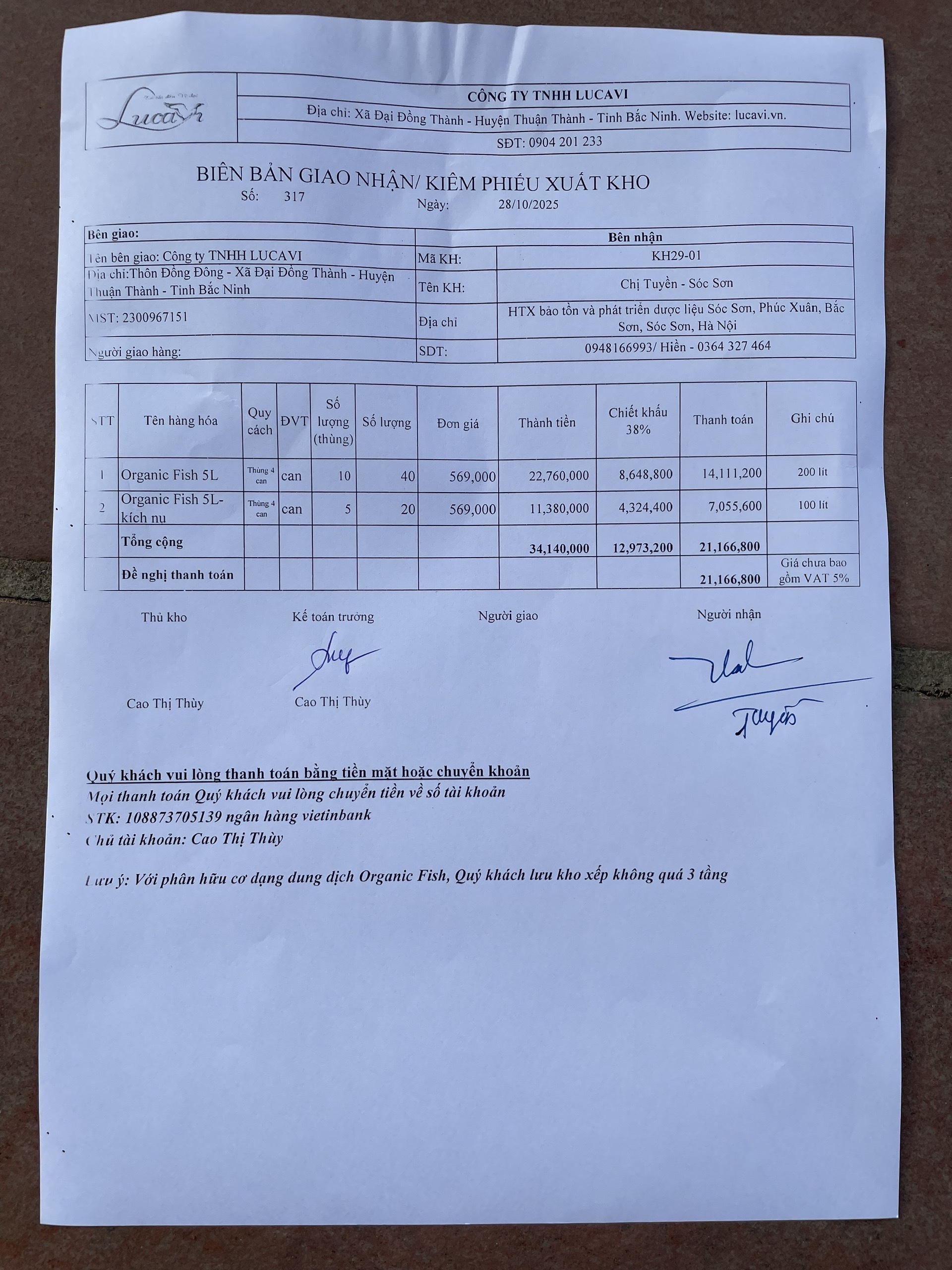 | 134 | Phân hữu cơ - Nhập kho phân bón hữu cơ Lucavi. Khu 1 nhập kho 4 thùng phân Organic Fish (Thùng 4 chai 5L) tổng 80 Lít và 2 thùng Organic Fish kích nụ (Thùng 4 chai 5L) tổng 40 Lít. |