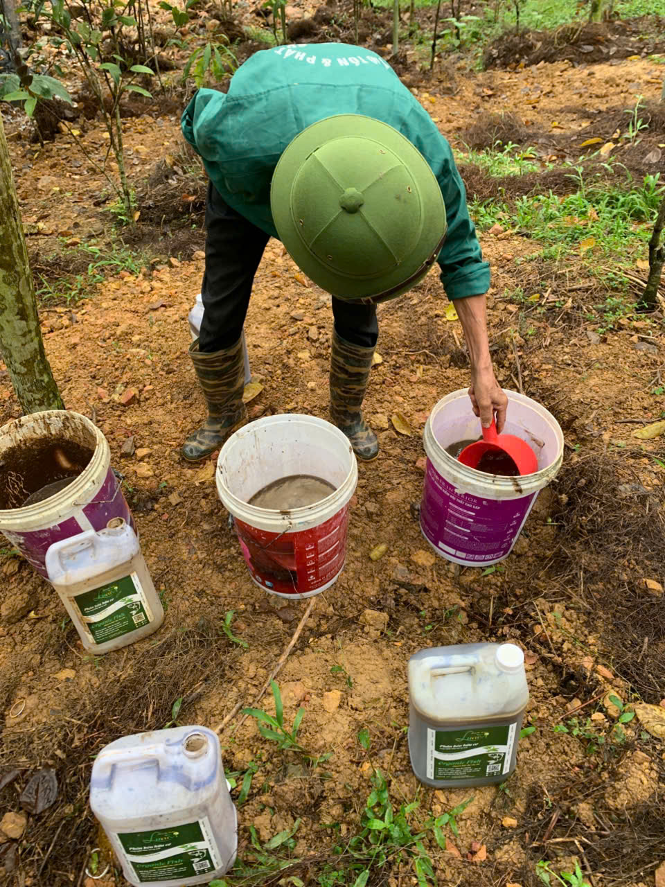 | 130 | Bón Thúc - Tiến hành bón phân cho 1 số khu vực đã thu hoạch lá cho cây Trà Hoa Vàng. Sử dụng phân hữu cơ LUCAVI dạng dung dịch - Lượng bón: • Cây nhỏ: tưới 100ml dung dịch phân bón • Cây nhỡ: tưới 150ml dung dịch phân bón - Cách bón: Tưới gốc dung dịch phân bón đậm đặc, sau đó tưới nước để phân ngấm dần vào đất. Tổng dung lượng bón là 100 lít (20 can 5lit) dung dịch Lucavi. |