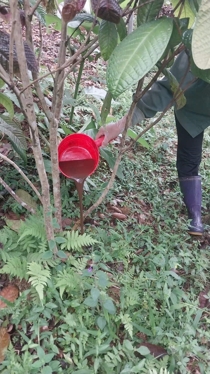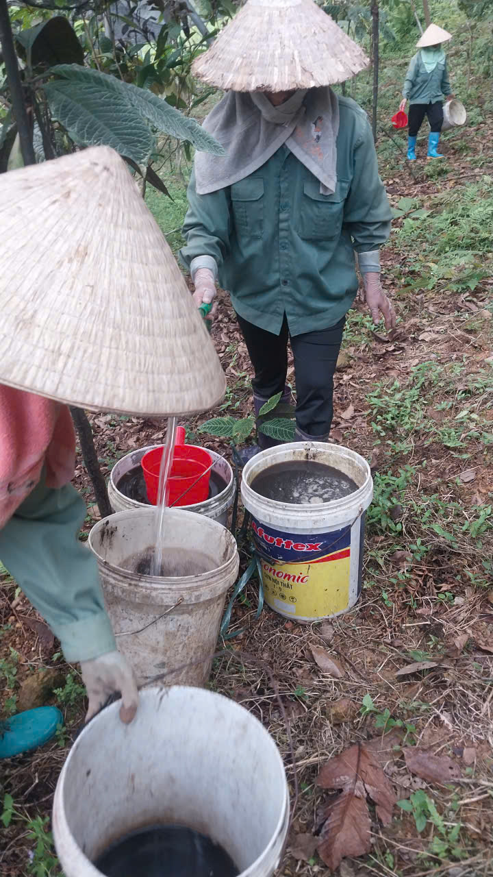 | 95 | Bón Thúc - Tiến hành bón phân cho cây Trà Hoa Vàng. Sử dụng phân hữu cơ LUCAVI dạng dung dịch - Lượng bón: • Cây nhỏ: tưới 100ml dung dịch phân bón • Cây nhỡ: tưới 150ml dung dịch phân bón - Cách bón: Tưới gốc quanh gốc trà bằng dung dịch phân bón đậm đặc, sau đó tưới nước để phân ngấm dần vào đất. Tổng dung lượng bón cho toàn bộ vườn trà là 120 lít dung dịch Lucavi. |