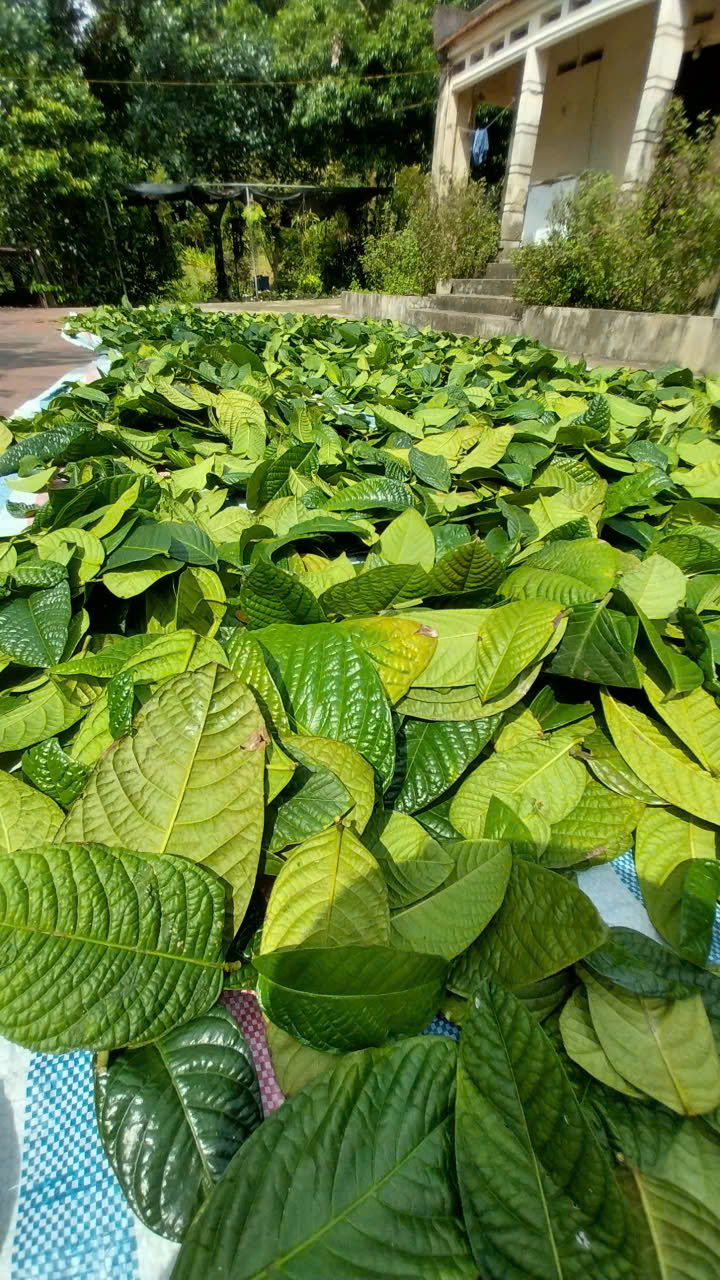 9 | Phơi sấy thủ công - Sau khi thu hoạch về lá trà được phơi sấy thủ công trên lớp bạt dứa và cách ly với khu vực chăn nuôi. |