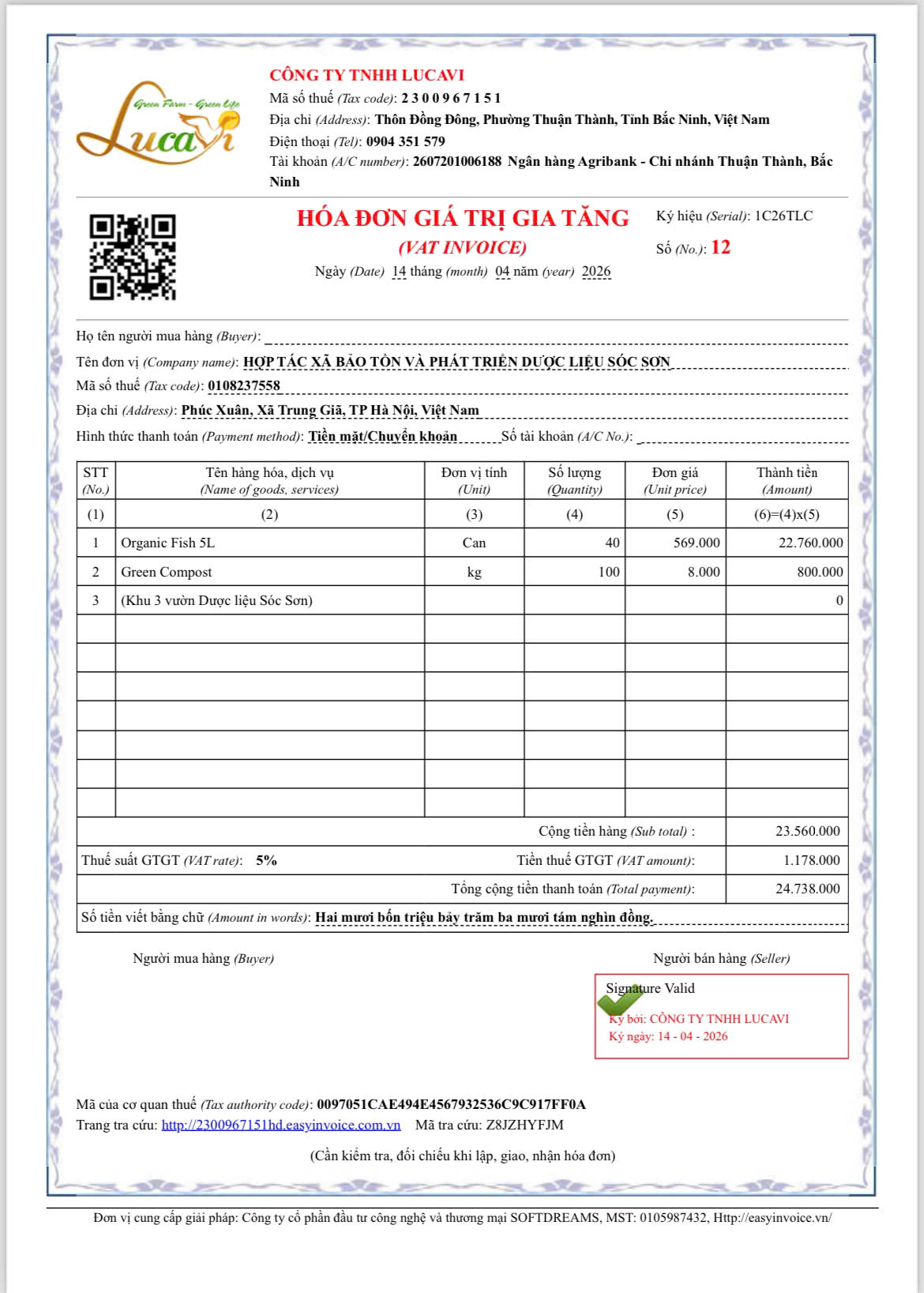 | 14-04-2026 12:04:00 | Phân hữu cơ | Nhập kho 100 (Lít) phân Lucavi Organic Fist + 100 (Lít) Lucavi Kích nụ + 100 (Kg) Green Compost. Sau đó phân phát cho khu 3.1 50Kg Green Compost và 20 lít Lucavi Organic Fist. | Hoàn thành |